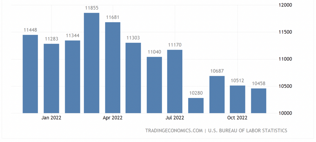 While some companies, particularly in the tech, have already announced they are cutting off jobs, several other big-name firms like Walmart and FedEx have indicated plans to freeze hiring at the end of last year. But as shown in the figures above, labor demand remains historically high.