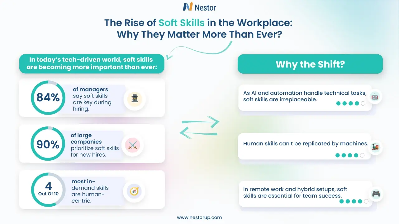 While technical expertise remains valuable, soft skills are increasingly seen as critical for career growth, especially in the face of automation and AI advancements A recent study shows that 84% of employees and managers believe new hires must possess and demonstrate soft skills during the hiring process ā a figure that jumps to 90% in companies with over 500 employees.